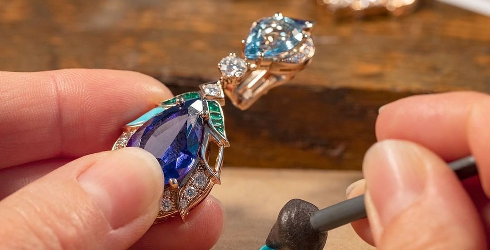 The Barocko Peacock necklace made up of a luscious mix of tanzanite and aquamarine drops, emeralds, sapphires, turquoise, chrysoprase and diamonds. Progress photo.