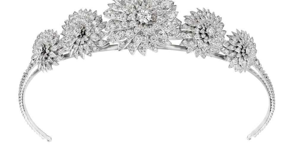 Snow-set diamonds mimic blossoming magnolias. Leaves and buds transform into off-centre tiaras and brooches — one graced with a 2.02-carat pear-shaped diamond.