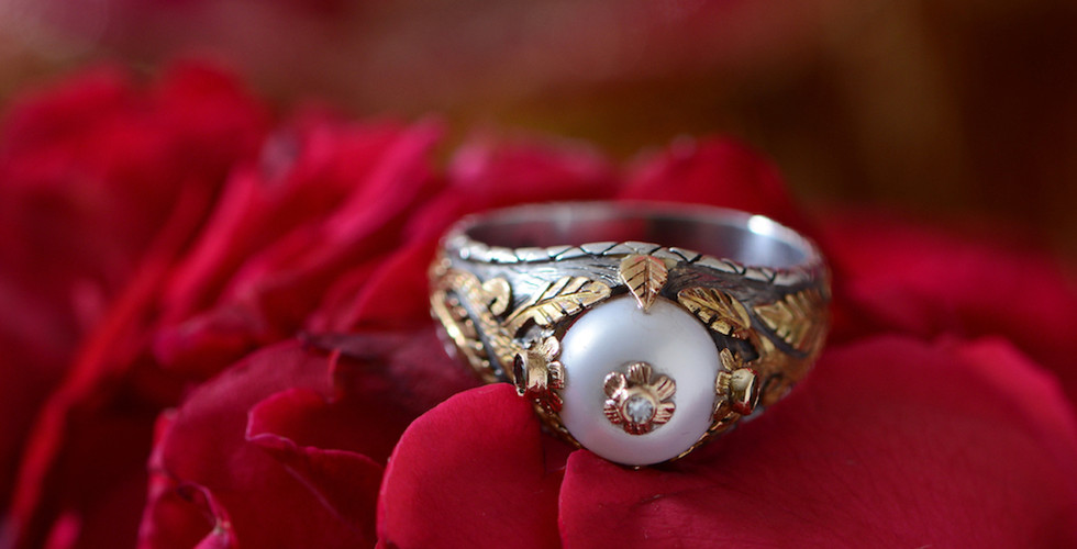 Oriana Pearl Tsavorite Diamond fine jewellery collection, It features a central pearl which is embedded with a full cut diamond set in an 18ct gold flower. The pearl is flanked by two tsavorites which are also set in 18ct gold. The ring has ornate 18ct gold and oxidized sterling silver hand engraving work on it