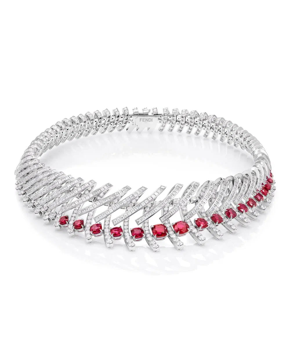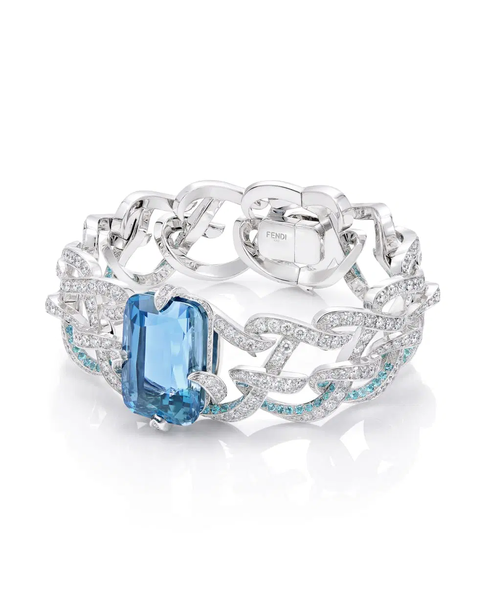 This tension—between stillness and movement, delicacy and monumental force—became the heartbeat of the collection. Each jewel feels like a water structure frozen mid-performance: arches, cascades, ripples captured in diamonds, crystal rock, and Fendi’s quiet signature—the double F—woven in so subtly you’re never quite sure whether you saw it or only dreamed it.