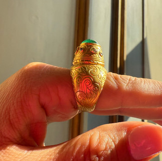 I can only see advantages to working with 22K gold. It is less soft than 24K gold, which was used in ancient times, due to the addition of silver and copper. My rings are unique pieces, entirely handmade, as is the engraving, and 22-karat gold lends itself perfectly to this.