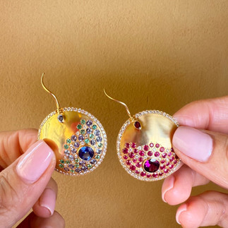 JP: With pieces like earrings, bracelets, and necklaces in 18K gold set with vibrant stones like tanzanite, sapphire, and ruby, how do you use color and form to convey the playful yet provocative idea of life as a “race” and an “adventure”?