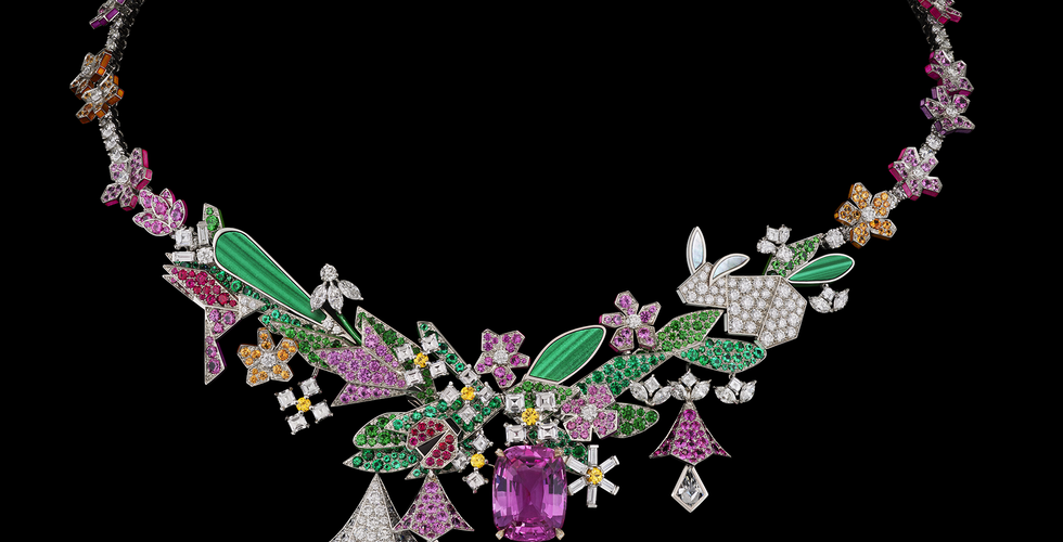 Completing this marvellous theatre, yellow and rose gold foliage mingles with luxuriant shrubbery and flowerbeds studded with jewels resembling delicate petals. As the final surprise heralding the second story, Diorigami, the collection features a necklace, a ring, and elegant earrings that portray flourishing greenery, enhancing this sumptuous selection.
